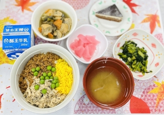 本日は「鶏めし風」を提供しました。甘辛く煮た鶏そぼろや、椎茸と合わせて煮た蒸し鶏、錦糸卵をご飯にのせて、彩りにグリンピースを飾りました。ご利用者さまからは「うんとおいしい」「量が多かったけど食べれたよ」とのお声が聞かれ、お箸の進みが良好でした。