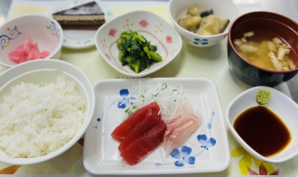 本日は、お楽しみメニューでお刺身を提供しました。今シーズンで初めての生ものの提供となりました。「こういう所で出るの珍しいね」「刺身うまいね」「おいしかったよ」とご自分からお声を掛けて下さる方がとっても多く、普段は食が進まない方も喜んで召し上がっていました。